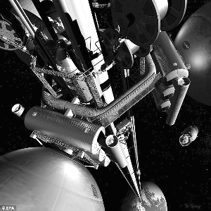 大林組計(jì)劃大約2025年開始修建天梯,先發(fā)射火箭將兩卷用碳納米管和其他材料制成的纜索運(yùn)至距地大約300千米的位置;再用宇宙飛船解開纜索,朝地面放去;與此同時(shí),飛船繼續(xù)飛升,攀至9.6萬(wàn)千米高處。這一高度大約是地球與月球距離的四分之一。