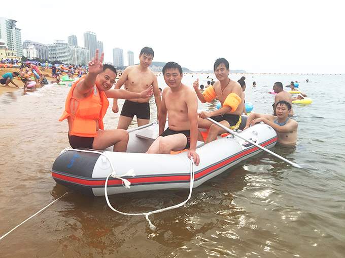 吃過午飯,我們一行人來到了威海國際海水浴場,不愧是國際海水浴場,灘緩沙細(xì),水質(zhì)清澈,松林環(huán)繞?;ú荨⑹顸c綴于岸邊,令人新曠神怡。看著那迷人的海灘和不斷奔涌而上的浪潮,遠(yuǎn)處氣勢磅礴的海面卷起的層層浪花,走在沙灘上,感受著浪花在腳上一次次的沖刷。換上泳衣,租個皮劃艇,同事們迫不及待的開始下水了。