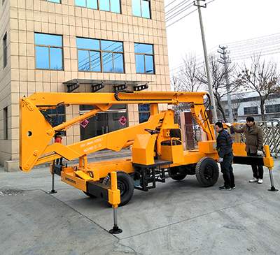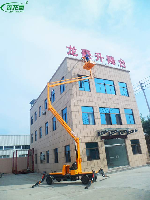 自行曲(折)臂式升降機升高時候是曲折狀態(tài)的,升降平臺的結構采用了機電液一體化、可靠性設計和計算機輔助設計等技術,是一種全液壓驅動、自行式專用底盤。突破了以往國內高空作業(yè)升降機只能采用汽車或起重機底盤改裝設計的限制。自行曲(折0臂升降機,曲臂式往往體積較小,帶載行駛、作業(yè)穩(wěn)定性好。底盤結構突破了傳統(tǒng)的設計理論和方法,通過優(yōu)化上車平臺總體布局與載荷分布,減少了重心偏移。采用獨特的大角度后仰式鉸點結構,合理設置多種配重模塊,有效地平衡了工作力矩。采用H型變截面復合箱梁剮性車架和高負荷橡膠輪胎,增加了底盤整體剛度,保證了整機行駛、作業(yè)過程的穩(wěn)定性實現(xiàn)了高空作業(yè)升降機帶載行駛的功能。通過大臂前端托架可以快速安裝舉升裝置或載人平臺,實現(xiàn)物料舉升、起重吊裝和載人高空作業(yè)等功能同時為擴展作業(yè)裝置以及各種工作裝置的快速切換提供了接口。設計的三維旋轉托舉裝置,既能夠自動保持被舉升物料的姿態(tài),又可以實現(xiàn)舉升物料在空間內任意高度、任意位置和任意方向的調整要求,速度控制精確靈敏,微動性能好,滿足了大型洞庫內高空作業(yè)與通風管道安裝的要求。